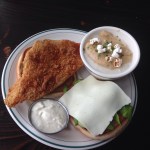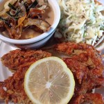 The fried catfish was IN-SANE-LY fresh and delicious. It was also very hot, and flaky, and crispy. It came on — what by now I think of as the “traditional” — trashy white bun, also with bread and butter pickles, and some nice tartar sauce on the side, where tartar sauce belongs. Five stars, Yo. On a five-star scale. The slice of ‘mer’can cheese on top was the coup de gras that delivered the final blow of deliciousness. I love American cheese. It just makes me feel damn proud to be an American, Y’all!