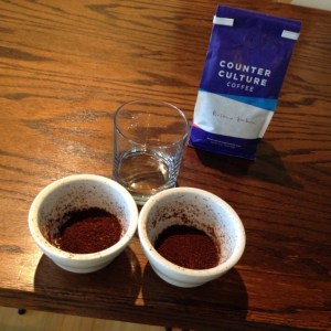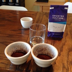 I walked in, met Lindsay Lee, the director of education, and she was super-friendly. There was one other coffee fan there, named Van, and he and I had a very fun and casual time with Lindsay, learning about coffee, and doing the Tasting with three different “sun-dried” coffees from Ethiopia. We were also joined by Chandra, who is Counter Culture’s grocery store sales-person, and Joe, a barista at High Five, who is apparently a regular at the tastings @ Ten. The whole thing took exactly one hour and was really great! I learned stuff. I met cool people. I had great coffee. I even laughed and had fun. Lindsay made us feel comfortable with our ignorance, and educated us without talking down to us. There was no coffee-snobbery going on as far as I could tell. I’m definitely going back for more of these Tastings @ Ten, and Lindsay signed me up for a Barista class on November 12th, so I’ll report back on my progress in getting my barista chops back in order! In the meantime, Please enjoy the pictures and captions below…