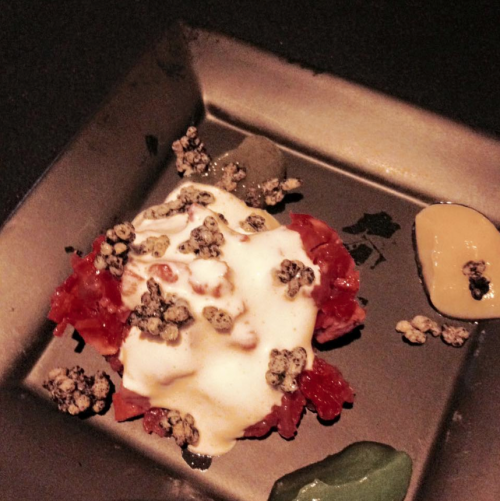 Screen shot 2015-12-14 at 8.32.37 AM Published December 14, 2015 at 500 × 501 in Blind Pig Asheville – Black Sheep Dinner ← Previous Next → Beef tatar w/ purees, imulsified fat, n puffed rice.