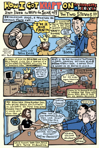 • If you settle, get something! Don’t go down quietly. I was very loud about my court case while it was happening. I called the 6 o’clock news, I wrote press releases, I posted on line, a punk band in Chicago called the Busy Kids wrote a song about it, my awesome friends in Boston did a rock show benefit for me, my GF at the time was a documentary film maker, so she made one about the case that was even screened at film fests and stuff… my point is: No fucking wonder, after a year of THAT public relations nightmare, and the aforementioned lawyers’ fees, that Kraft was more than ready to ask if I wanted to settle out of court. I said sure, and asked for 10 grand. They said no. I asked them to give 10 grand to the Comic Book Legal Defense Fund. They said no. (Dicks) That’s when my lawyers and the two Steves hammered out a deal to give the money to a third party, a non-profit, one that we picked. Fuck you, Kraft!