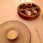 • The Next items to hit the white table cloth were oysters, both poached and raw with chestnuts and velouté. The plating in Eleven Madison Park is fantastic. Every single dish and item was soops cute to look at and the oysters were no exception. They tasted as good as they looked, and they came with a small dish of “soup,” that was actually an oyster velouté. If you don’t know what velouté is, don’t feel bad, I had to look it up on Wiki, where I found out that it’s one of the 5 “Mother sauces” of French Cuisine. I love French sauces. This little bowl of warm, creamy oyster velouté was awesome.