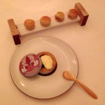 • Next came eggs Benny! You guys know I’ve been brunching like fuck here in Asheville and eating a ton of eggs Benedict, so I was highly amused when the Eleven Madison Park take on this fave dish came out. The eggs were caviar, and the four English muffins were miniature! SQUEEEEE! I love miniature food! The plating was awesome of course, and consisted of a caviar tin filled with finely chopped potatoes and ham, caviar, and Hollandaise. The tiny English muffins came on their own little board. There was also a mother of pearl spoon involved, and that is an old tradition, because it is believed that a silver spoon can effect the flavor of caviar. It was hard to pick a fave dish of the night, but this may have been it.