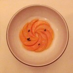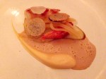 • Next on the menu was crab salad with sea urchin and kohlrabi. It was served ceviche style, and came in the cutest little stack. I had never eaten sea urchin before, and I’m somewhat embarrassed to admit that I had to look up kohlrabi on Wiki too. It’s cabbage. So, this little stack o’ stuff was basically a super-high-end seafood salad with slaw. It was fucking amazing. Perhaps the lightest dish of the night, it was also the most delicate in terms of flavor, and appearance. It looked and tasted like fairy food, and more or less melted in our mouths. Again, the photo doesn’t even begin to show how cute this dish was.