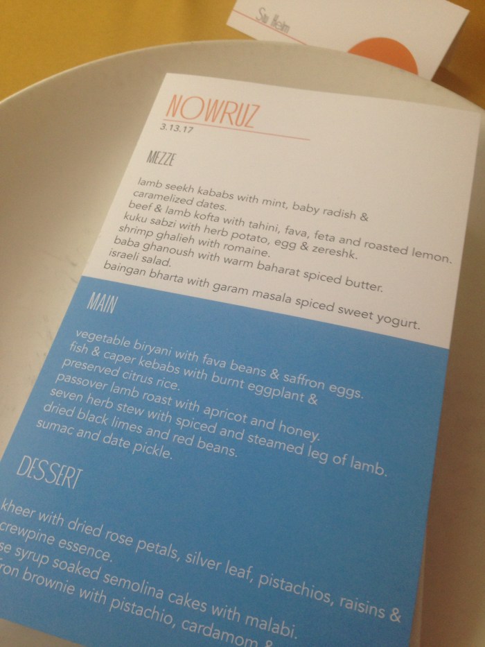 I was lucky enough to be invited to the NOWRUZ (new day) dinner at TABLE, which was a big, family style meal, cooked and served by three of the greatest Chefs in town: CHEF Jacob Sessoms (TABLE), Chef Meherwan Irani (CHAI PANI), and Chef Reza Satayesh (BABA NAHM), and combined foodS that were cooked in Farsi, Safardic, and Indian styles. It was fun, festive, and fantastically delicious. Below please find photos of the food, menu, and chefs. Good times, great people, Asheville, NC.