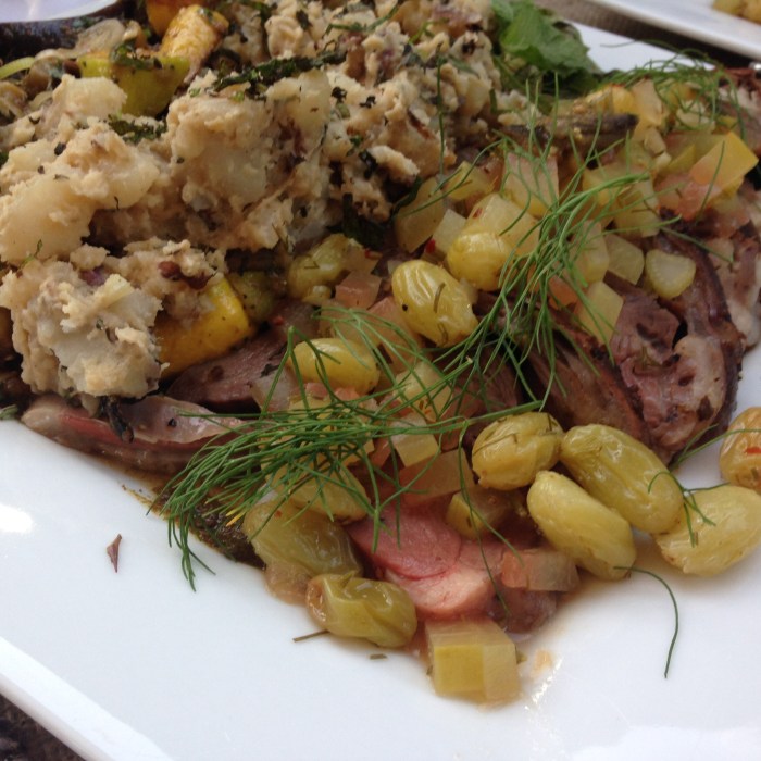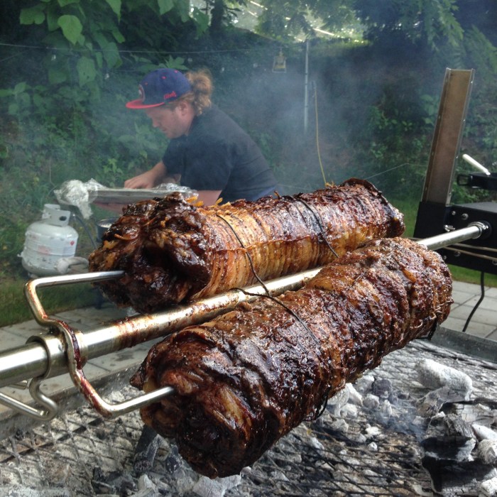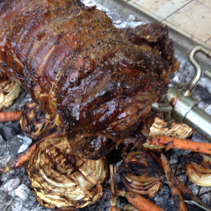 Course 3) Above the Fire Coal Roasted Lambcetta – vegetable stuffed lamb, herbs, in the coals roasted sweet potato, corn