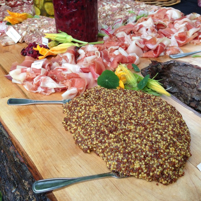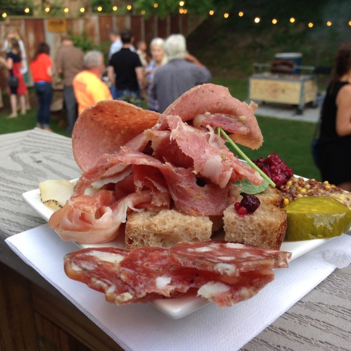 Course 1) Appalachian Charcuterie Board and Accoutrements highlighting UO Cider Salami, Coppa, Lomo, 18 month old Pisgah Ham, Lusty Monk UO Cider Mustard