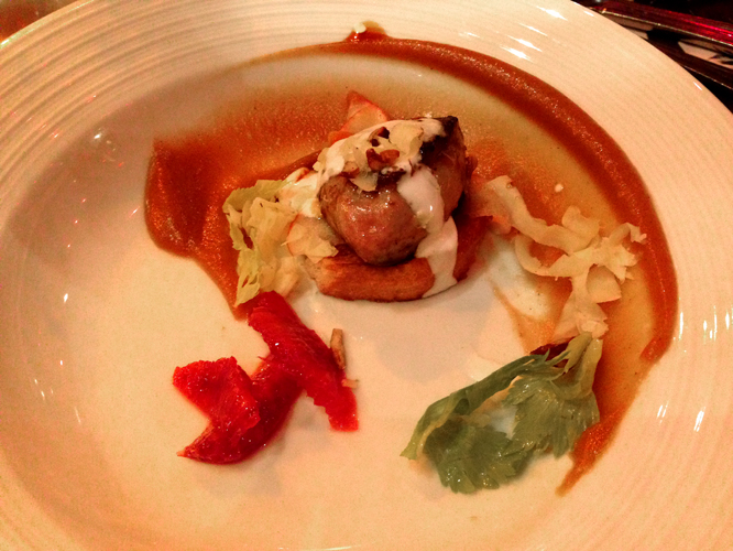 It was a fixed, five course menu, and I CLEANED every plate. This was some fancy eatin’ for sure, that not only included an “amuse” but also an “intermisso,” which are two teeny-tiny bites — one at the beginning of the meal and one in the middle — that serve to wake the palate up in the first case, and shift gears in the 2nd.