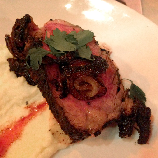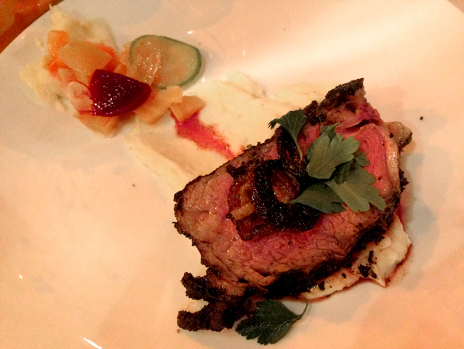 BELOW (next two): Prime Ribeye – Leek ash, preserved beet, shaved carrot, cipollini, pommes puree.