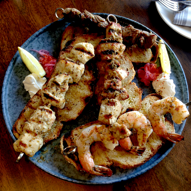 Above: Beef, pork, chicken, and shrimp skewers with bread, herbs, and oil.