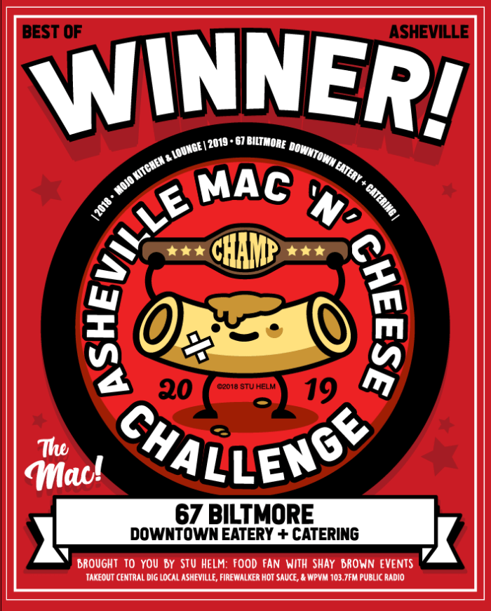 Cutting to the chase, congrats to our new Asheville Mac ‘n’ Cheese Champions, 67 Biltmore Downtown Eatery + Catering! You have earned the respect of the judges, the admiration of your fellow competitors, and street cred with the people, as well as (and this is a the best part) a SPIFFY GRAPHIC!!! (see below) This high-quality, full-color graphic is not only suitable for printing, but (get this) can also be FRAMED once printed! Holy fuck! Can anything in this world top the never-ending joy of graphics?!? Hell. No.
