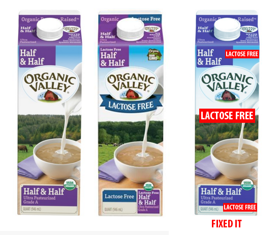 OR I don’t enjoy. I notice an odd taste or texture, so I take closer look at the packaging, and AH HA! I discover that while it’s a product that looks like my usual purchase, it has some tasteful dark blue banners that gently seek to make the careful shopper aware that no, this is not your beloved favorite, that you can recognize in an instant, it’s an impostor! One that is free of something crucial that I don’t need or want to be free of.