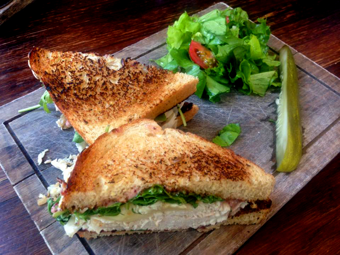 7) SMOKED TURKEY SANDWICH – My boss Paddy and I are always going on our “Asheville Food Tours lunch junkets,” which is just us eating lunch, while nerding-out about food tours at as many different restaurants in and around town as we can. It’s fun! We don’t always get good food, it’s true, but when we do, it makes us both super happy, and we get twice as nerdy, enthusiastically analyzing every bite. It’s like a D&D, only with sandwiches instead of ogres and shit. Last week, we took a junket close to home, at the Blackbird restaurant on Biltmore Ave. They are a regular stop on our food tours, and of course we like to frequent our restaurant partners as often as possible. Paddy ordered the shrimp po’ boy and I asked for the smoked turkey sandwich. Paddy raved about his po boy, even going so far as to tell me that he’s been on the hunt for the perfect shrimp po’ boy here in Asheville for years, and this is in the best one he’s ever had. Cross my fingers, that’s what he said. For my part, the smoked turkey made me very happy, and was great! I don’t how they toasted the house-made bread it came on, but it had, like, an open-flame flavor and char to it, that was very unique, and slightly smokey, and “campy” in a way. Like you might make over a fire at camp. It was outstanding. The turkey breast at Blackbird is smoked in-house, is of a high quality in my opinion, and for me, on this sandwich, it was cooked exactly right. Turkey can be dry, and boring. This turkey was neither of those things, and was both moist and flavorful. The warm brie and cranberry mayo were subtle, yet crucial to the enjoyment of this sandwich, and I also applaud them for not calling it “cranberry aioli,” because that would mean cranberry garlic mayonnaise, and… no. No thank you. There was also the perfect amount of green stuff on the sandwich, and the side salad was also the perfect size, in my opinion: Tiny. The dill pickle spears at Blackbird are made-in house, and Paddy goes on and on about their dill pickle in fact. He loves that dang pickle. All in all a very enjoyable junket! Thanks, Blackbird!