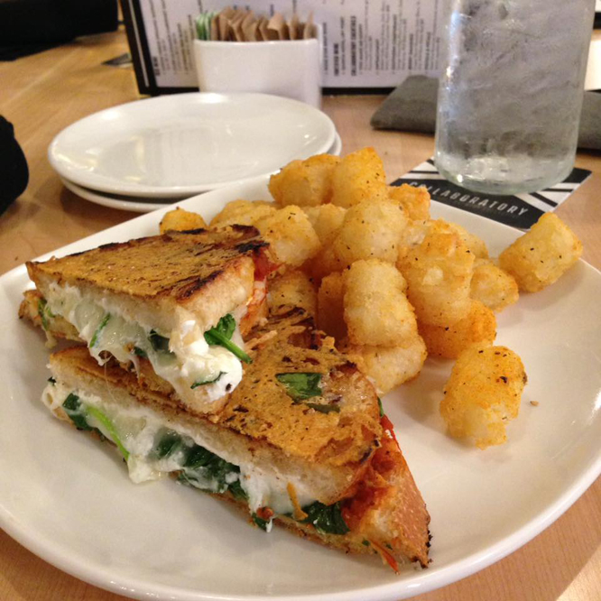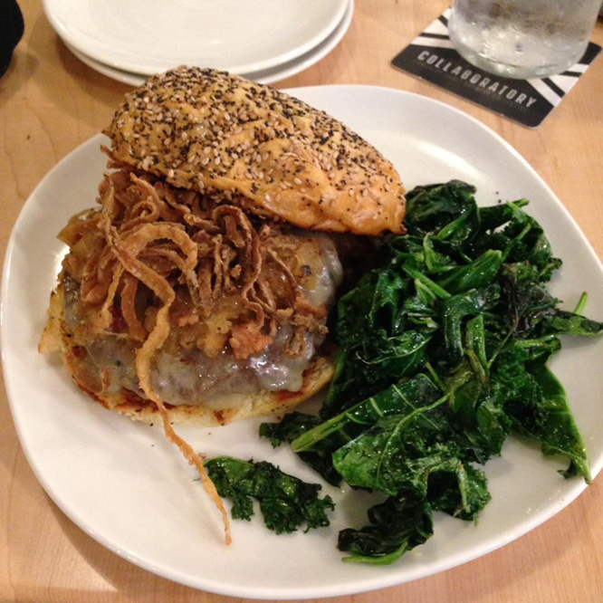 5) MY JAM BURGER – As I mentioned Paddy and split the grilled cheese reviewed above, as well as a burger on our junket to Collaboratory. They have several named burgers on their menu, and we ordered one called the “My Jam” burger, which features smoked tomato jam along with Cheddar cheese and crispy straw onions. It came served on an everything seeded brioche, which has the initials printed “GFO” next to it on the menu. That might mean “Gluten Free / Organic,” or “Gluten Free Option,” or perhaps “Government Financial Office.” Or just Goofy Foofy Oofy? Dunno. Didn’t ask. So many initials on so many menus now days. Is “V” for “vegan” or “vegetarian?” I literally don’t know what “O” stands for on any menu, and I have a LOT of experience reading menus. Anyhoo… back to the burger. You can also add Bacon for $2. We did that. Aaand (drum roll please!) it was fuckin’ great! Truly tasty and delicious! The beef, bun, straw onions et al were flavorful, complimentary of each other, and texturally pleasing, Paddy and I both approved. The sauteed greens were also quite good and we ate them all. In fact we ate every bite of both plates of food, except the tater tots, which were just slightly undercooked. The burger was just a tad overcooked, I have to say, and not the medium-rare that we ordered, but hat was honestly no big deal, because the flavor of the burger was fantastic, and every single other aspect of the burger was great! Plus, they are a brand new place that just opened the very week before we went in, so they’ll dial it in, I’m sure. Paddy and I agreed that Collaboratory is a fine new addition to our downtown food scene! They improved the space itself by about a thousand-fold in my opinion, by opening it up, making it brighter, but not too bright, adding a TON more seats, and making it much more inviting and friendly. Please go in on your own, try this, and other burgers for yourself, hit up that the crunchy grilled cheese for sure, be sure to ask ’em to crisp up your tots real good, and don’t forget to eat your greens. I think you’ll have a good experience. Let me know!
