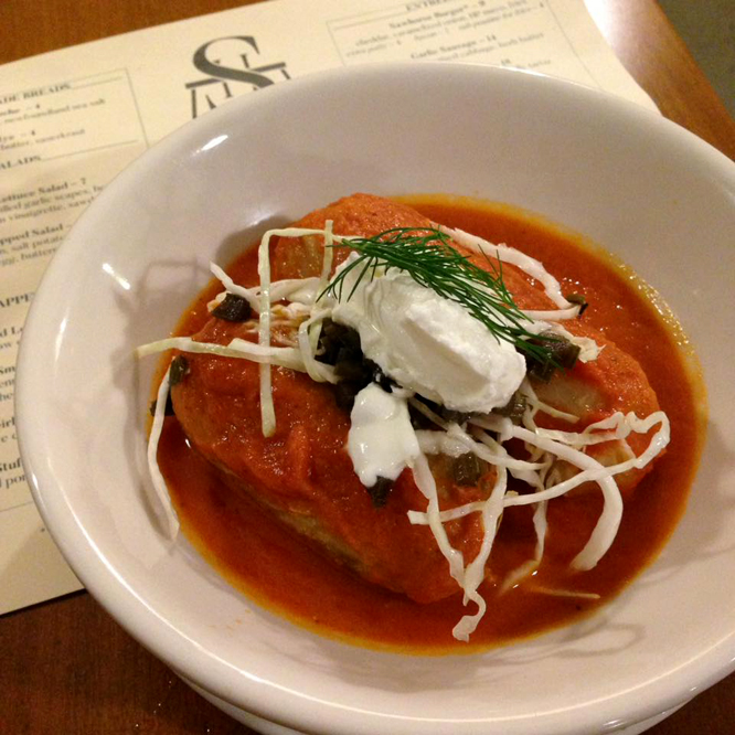 9) STUFFED CABBAGE – I guess you could say I like it, because I recently returned to Sawhorse for a third visit, this time at the dinner hour, with my family, and we all ate several great things, but I want to just focus one of them: The stuffed cabbage. It was fan-fucking-tastic, and I have been craving it ever since! Craving something after the fact is one of the true tests of excellence in my opinion. There are some foods that are really great, but we don’t crave them. Other dishes prey on our minds constantly, or in intervals, or even just every once in a while, and those foods are special. This dish was special! I don’t typically eat a lotta stuffed cabbage, but for some reason that night I was, like, “Hell yeah, cabbage me,” and I’m real glad I took that attitude, because, wow, I really loved it! As far as a description, I will leave that to the Chef Dan Silo, who had this to say, “The stuffed cabbage is totally inspired by a polish golumpki. My wife is from Chicago and I lived there for three years before moving to Asheville, and we used to go to a polish buffet all the time and get golumpkis by the pound. I think the traditional filling is ground beef and rice but I used sawhorse ingredients – whey braised pork shoulder and buckwheat groats. I cook the groats in the whey braising liquid, then shred all the pork and mix it with the cooked groats and some raw egg to bind it. The cabbage leaves are blanched in white wine and aromatics. The tomato sauce is 50% whey and 50% crushed tomato, cooked down for several hours with lots of celery, onion, garlic, dill seed, celery seed, and a touch of fennel seed.” I’m dying. Gotta get it again! My whole family is becoming a fan of Sawhorse, and I can’t wait to bring Dawn out there, because I know she will love it too! Northern fare is what they specialize in, and OF COURSE, don’t forget to save a little room for the amazing maple eclair!