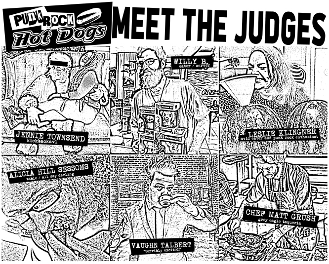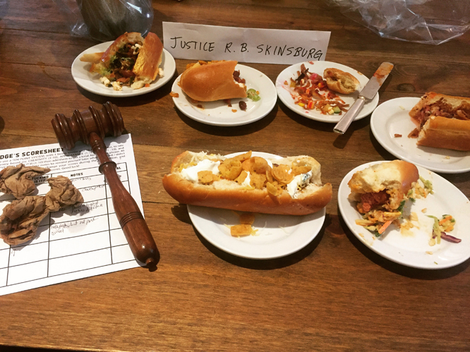 Thanks to Chief Justice Skinsburg and all the judges at The Punk Rock Hot Dog ~ Challenge! They were probably still full for days. At least three of them actually thought they were going to eat all six competing hot dogs, end to end, but that did not happen! Ha ha! For this contest, I introduced the idea of an eating partner, called a “second,” to cut down on food waste by helping the judges eat their dogs, and EVEN THEY couldn’t completely crush ’em all. Judging food contests ain’t no joke, Y’all. Those who do it are heroes. Titians. Gods. HA! I’ll always have openings on my judges panels for eaters, and pros alike, so stay tuned for your next opportunity to eat and judge things, just like Justice Skinsburg!