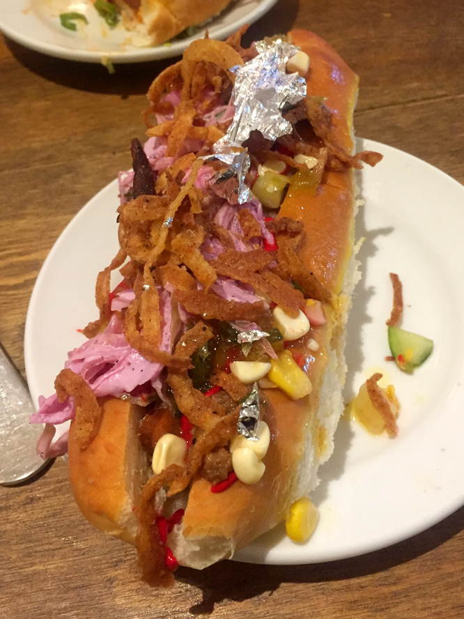 His gg allin inspired “Toilet Dog” was visually stunning, tasted amazing, and was PUNK AS FUCK. It included green relish to represent vomit, chili to represent shit, corn relish because “sometimes there’s corn in shit,” the brightest red MUSTARD I have ever seen in my life to represent blood, pink pickle to represent “punk rock / prolapsed asshole,” a dyed yellow bun to make it look piss-soaked, and dyed red hot dogs to represent “bloody butthole.” Jesus fuck. That’s some punk shit right there.