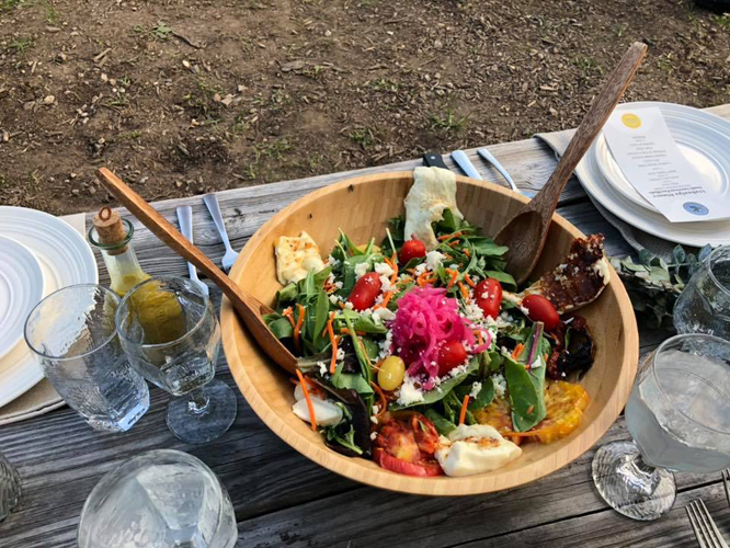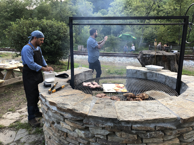 Now, it weren’t ezzackly fancy in the traditional way, because we ate outside, at picnic tables, behind a bar, from a pit fire, in a van by the river! Well, maybe not IN a van, per se, but there was a food truck, and an open pit BBQ, and one of the most talented Chefs in Asheville, Santiago Vargas was flippin’ meats, and grillin’ veggies and cheese on the pit. When I saw the menu, I was really happy, because there was a salad, and then NBM: Nuthin’ But Meat. Chicken, beef, and pork. Three of my favorite things ever. There were also some grilled chicken hearts, and those were fucking awesome. I do like me some organ meats, and I’ve eaten all kinds of hearts, livers, sweetbreads and all that shit. Some I like more than others. These chicken hearts were the best I’ve ever had — no kidding — and a great way to start the evening.