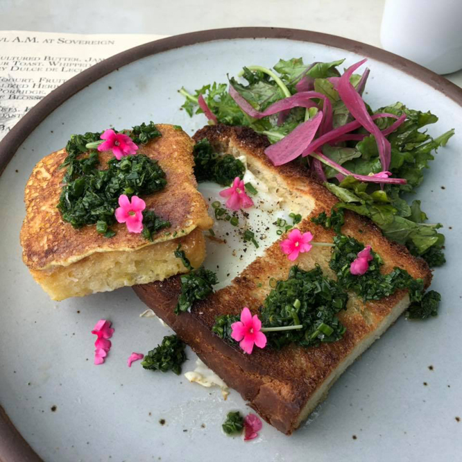 2) TOAD IN THE SUNSHINE – Two of the very best food venues in Asheville are teaming-up to present breakfast everyday in Downtown Asheville, we went and it was awesome. Sovereign Remedies and OWL Bakery are doing “Owl Mornings” from 8am until 2pm, Monday through Friday, and the combined talents of Chef Susannah Gebhart from OWL and Chef Graham House and crew from Sovereign is a winning combo, fer rillz. Dawn and I went to the very first one, and I had the “Toad in the Sunshine,” which is their take on the classic breakfast dish Toad in a Hole, and I’m not sure what the diff is, unless it’s just #positivity which it absolutely could be. In any case, it’s basically toast with a hole cut in it and an egg dropped into the hole. In this case the toast was OWL Bakery pain de mie, which is a kind of soft, French sandwich bread. It also had gremolata, which is typically chopped herb, with lemon zest, garlic and parsley. It was all excellent, flavorful, simple, yet refined. The coup de grace was the piece of bread from the hole in the toast, which is usually placed back on top of the egg, generally at a jaunty angle, and such was the case here, only — even better — it was turned into a wee little piece of French toast! WHAAAA? So cute! What a genius idea. There was also a small salad of greens and pickled onions, as well as edible flowers. Pretty to look at, delicious to eat! I’ll be back for more for sure. (PS – Have gone back three times since writing this)