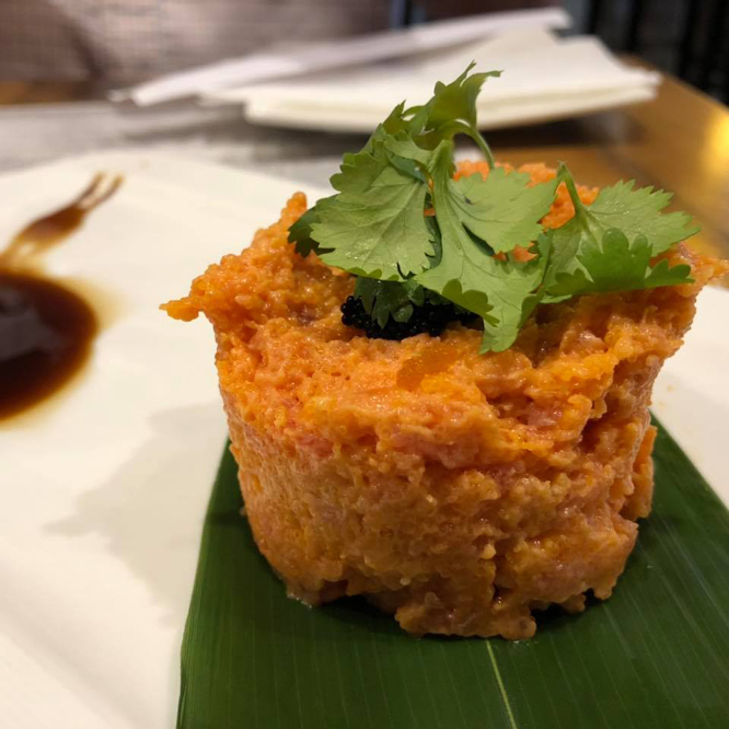 8) SPICY TUNA TARTARE – On yet another Asheville Food Tours lunch junket, Paddy and had lunch at Red Ginger Dim Sum on Patton Ave downtown. I’m a big fan of this place, and judging by how busy they get these days, a lot of other folks are too. That makes me happy! Chefs Ben Chen and Kevin Jiang‘s menu is extensive but with help from various sources, I found a bunch dishes that I really enjoy, and have been adding a new favorites to my list as I work my way through their offerings. Paddy likes raw meats of all kinds, and I had never tried their tuna tartare, so we ordered it. When it arrived, we both looked at the bright orange cylinder of finely chopped stuff on a banana leaf with… curiosity? But what the fuck, we ain’t new, so we tucked right in. Short story: Yum. Fuckin’ aye, good, Yo! The flavor was not too spicy, but just piquant enough to give it a sort of “deviled’ quality. I’ll say it’s a lot of food of all of the same texture for just two people to eat. Two normal people that is, because Paddy and I crushed it no problem. I’m planning to order it again in the future, and making some other menu choices that I think will contrast with, and enhance the unique flavor and texture of this dish. If you’re like me and Paddy and you like raw meats, go give this little pile of orange stuff a try, order something crispy with it, and let us know what you think the next time you see us out on one of our junkets!