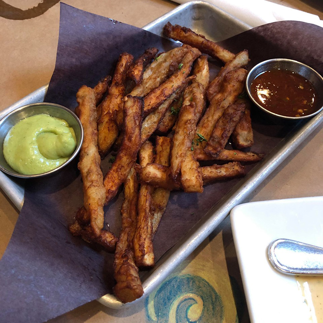 8) EGGPLANT FRIES – I took a road trip out to Hendersonville with my friends Luis and Laura, with a specific mission to EAT BUGS. Yes, we were hot on trail of tacos chapulines, or grasshopper tacos, which are available at a place called Never Blue, right on Main Street in the supes adorbs downtown Hendersonville. Makes parts of downtown Asheville look like Shit-Hole City, Y’all. Just sayin’. We’re getting’ out-cuted by Hendersonville. Anyhoo, I’ll get to the grasshopper tacos in a minute, but we ordered a bunch of food from the very eclectic Never Blue menu, and I want to give a shout-out to the eggplant fries that Laura purchased for the table to share. They were fucking great! Like, really tasty, and enjoyable, and at the end of the dinner, we agreed that they were a highlight of the meal. Lighter and crispier than a french fried potato, they elicited excited reviews from all three of us in the moment. Reviews, Like, “These are gooood,” and, “mmm-hmmmI” and “fuckitty fuck fuck fuck tasty fuck fuck yum tasty fuck.” (That last review was mine.) We devoured them all in about two minutes flat. They came with a dill-mint toum (which is a form of aioli) and agrio dulce which is a sweet and sour sauce. Both sauces were great, and went well together! I was about half an inch away from ordering another round of these delicious fries — all for my fuckin’ self! — but decided I was probably better off not over-doing it, as I had a giant ravioli and a grasshopper taco in my immediate future. Plus the dessert menu looked pretty intriguing. Sooo, if you find yourself in Hendersonville, and you want to try something that got six thumbs up from me and my two friends, pop into Never Blue and order up some eggplant fries.