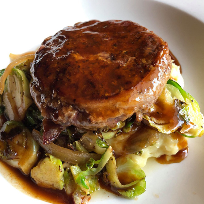 7) GUSTAVO’S OLD SCHOOL HAMBURGER STEAK – My mom and I took a trip out to Stoney Knob Cafe, where I had earlier in the year enjoyed a nice meal with my sister and her husband. My mom was soops jelz, so we got in the car, and vroom vroom, there we were! Our server was excellent, and as I mentioned in my first post about this restaurant, the decor and atmosphere at Stoney Knob are eclectic, interesting, and fun. I was happy to return! The menu has a little bit of everything, and all of it sounds really good, so it was a difficult choice, but I eventually landed on something called Gustavo’s Old School Hamburger Steak. I’m old school in many ways, and just old in others, but this appealed to me for sure! A steak-burger made from house ground short rib and rib eye,  wrapped in bacon, and char grilled. Topped with a demi glace, and served on a bed of caramelized onions, roasted Brussels sprouts, and whipped taters. It. Was. Friggin’. AWESOME! I showed up hungry and ate every morsel of food on my plate. I scraaaaaped up every last bit of mashed taters and demi that I could, and if it wasn’t for the fact that my mother — the great arbiter of table manners — was sitting across from me, I would have licked the frickin’ plate. The texture of the ground meat was perfect and the cook was too. The demi galce was very tasty and savory and warm and comforting, The bacon was subtle and unobtrusive, yet integral to the flavor. The pile of veg underneath was likewise perfectly cooked and tasty AF. Smooth whipped taters, soft not mushy Brussels, and onions that were cooked to death, the way a caramelized onion ought to be. You know that I don’t usually cotton to too many onions (or any raw onions) but I ate all of these, so that should tell you how good they were! I don’t know who Gustavo is, but I admire his old school ways. He and I, we are the same. I recommend this entree very much for you, if you are one of us.