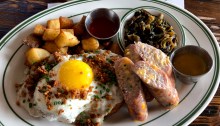 SUNDAY BRUNCH AT BUXTON HALL! Food so good it brought a tear to my eye, for real. Biscuits ‘n’ gravy with cheddar sausage, taters, and collard greens, and a SUPER STAR cinnamon roll.