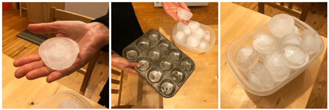 A: Dawn uses an old fashioned (ancient!) muffin tin to make perfect, large, slightly tapered hockey puck-shaped pieces of ice that nestle into a typical cocktail glass quite nicely. ! We tried a few different methods, but she discovered this one is the best.