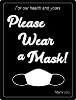 A couple of Downtown business owners asked me to design a “No Mask, No Shirt, No Shoes, No Service” sign, so here they are. Click thumbnails to open high resolution jpeg files for printing. If you need a printer, I recommend Henco Reprographics.