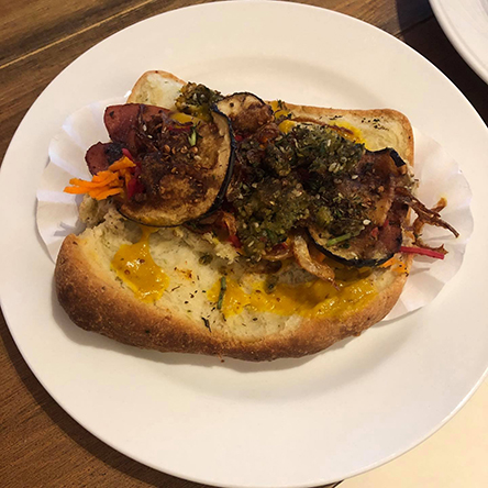 In Zack’s own words, “It was the underdog. Chosen to represent bad vibes. A local punk band that actually recorded an album in my basement during quarantine. Their name is bad vibes. Each ingredient represented a member of the band. It had arugula, chimmichurri, ginger balsamic bacon jam and shoestring potato” Zack was helped by Caitlyn Hope Wood and Justin Owen.