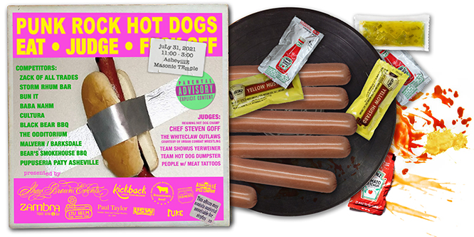 Happy National Hot Dog Day, Y’all! Eat dogs! Think about dogs! LIVE AND BREATHE HOT DOGS!!!! And get ready for July 31st and the 2nd ever Punk Rock Hot Dogs competition at the The Asheville Masonic Temple! In 2019, there were six competitors and the winner was Chef Steven Goff (ex Aux Bar, currently at Jargon) with his GG Allin-insipred “Toilet Dog.” This year, Chef Goff is our head judge, and there are TEN Hot Dog Slingers vying for the prize! Here are some images from last time!