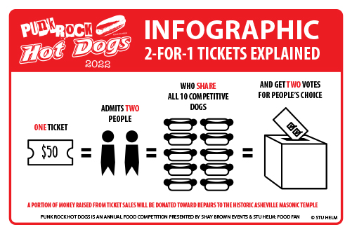 Punk Rock Hot Dogs is the only food competition in Asheville in which the People’s Choice is REAL. Your ticket gets you all ten dogs to try, so that you can make an informed decision when it comes time to vote! The judges’ panel takes it one step further by being a blind taste test!