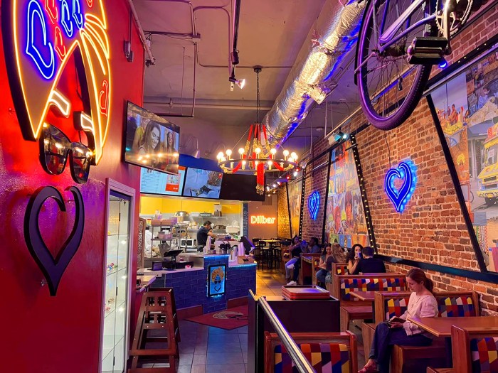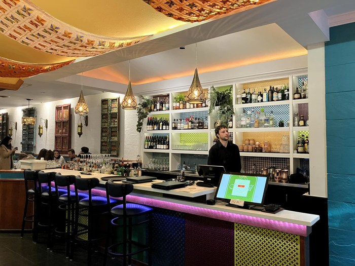 The spaces that these two new spots occupy have been notoriously dark, and uninviting for years, and the previous occupants struggled with that. Mëhfil (above) is colorful and well lit, bright enough to enjoy lunch during the day, and then when the lights are dimmed for dinner, it becomes a great date night or special dinner spot. Dilbar (below) had an even bigger hurdle to jump, their space is tiny, long, narrow, and gets almost no natural light. Solution: Fill it with super-natural light! Neon, fairy lights, and televisions showing Bollywood clips and videos, Indian food being made and plated, light up menus, etc etc. The contrast between the decor of the two restaurants is as stark as that of their menus, and like the food, the decor for each if superlative, and they are both winners of my 2022 Best Decor award!