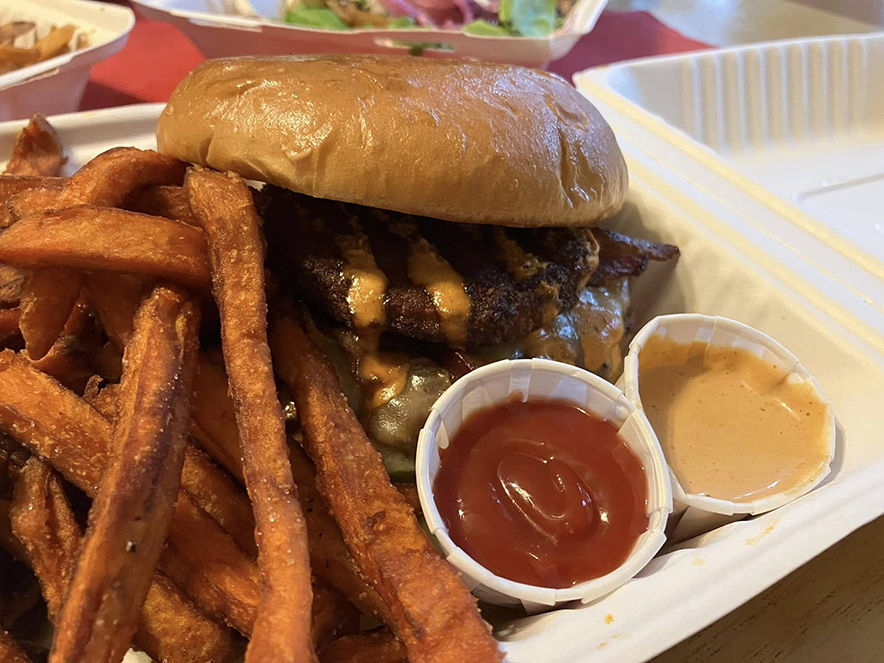For several years now, some of Asheville’s most consistently excellent food has been coming from Chef Macario Jimenez and his crew on board the Sabora Food Truck. I’m a big fan of the food as well the people who make it. I admire Chef Macario’s entrepreneurialism as much as his cooking, and I find him to always be friendly, polite, and professional! I only get a chance or two per year to eat off of his food truck, so when I had a chance early in 2024, I pounced and got a Ghost Maker Burger, which is topped with ghost pepper jack cheese, and chipotle mayo, plus lettuce, bacon, and a the coup de grâce hand-breaded friend green tomato. The bun was fresh and soft and grilled to be crispy on outside ridges. The whole thing was super-savory and a little on the spicy side!