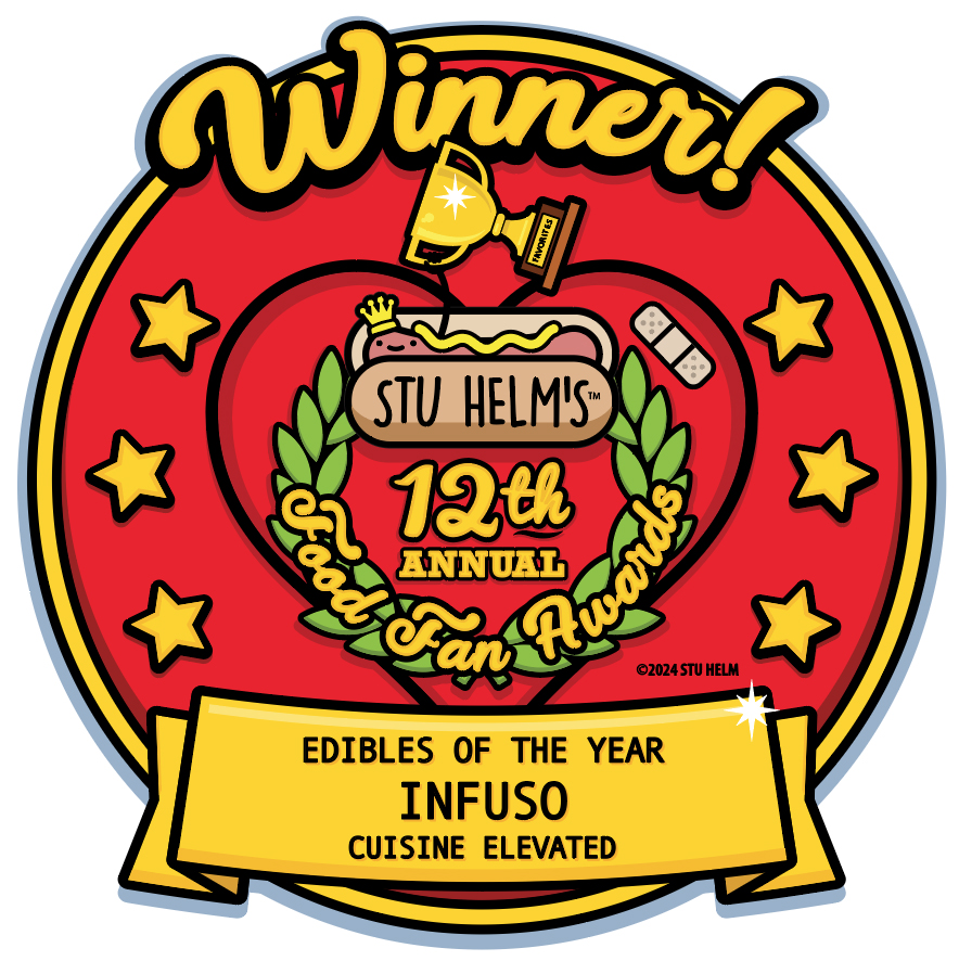 One Saturday evening last year, I was offered a very unique opportunity to attend a small, private, classic, 8-course dinner, with a twist. By classic I mean it started with soup, salad, and entree, then there was a palate cleansing sorbet course in the middle, followed by a cheese plate, then the main dish, a small plate, and finally dessert. The twist was that some part of every course was infused with THC, and/or CBD. The menu listed exactly how many mgs was in each dish. By the end of the night, I had consumed 13 mgs of THC and 22 of CBD. The dinner was hosted, prepared and served by Infuso, aka local husband and wife team Chefs Griffin & Katherine Riffe, the venue was The Green Room – Asheville, the DJ was Murkury, the interactive art was by Kitty Savage and the whole experience was unique, mellow, and super delicious. Each dish came out one at a time, so that the hot food was still hot when we ate it, which made a really big difference in terms of enjoyment! I’ve attended more than a few ticketed dinners where every dish was stone cold because they were all plated at the same time, then delivered. My respect for the two young chefs for figuring it out! Every course was really tasty, but the standout dishes for me were: The braised short rib which was meaty & tender, it was cooked perfectly, was very dank in flavor & served with taters and root veg; The chilled soba which was soft, silky, tasty, & refreshing; And the pot du crème was rich, creamy, plentiful, and super delicious! Also a shout out to the pineberry sorbet which was resting in a small pool of sweet cream. YUM! So, the food was perfect, let alone the fact that it was infused, which is just such a cool, added bonus, and a cutting edge way to work with THC and CBD, which is why this whole meal and concept is my Edibles of the Year winner!