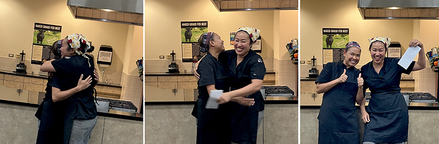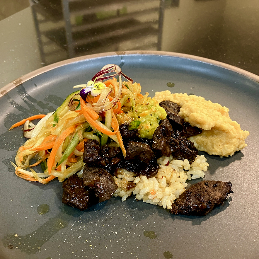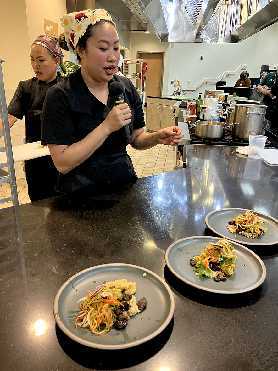 The mystery ingredients along the way included a chicken leg, sunflower butter, broccoli chips, pork loin, and a fruit cup among other things. Each team had about 45 mins to plan, cook and plate their dishes. All four teams did a great job and their dishes were very tasty! When it came down to it, the judging was tight, but in the end there was only one winner, and they crushed it!