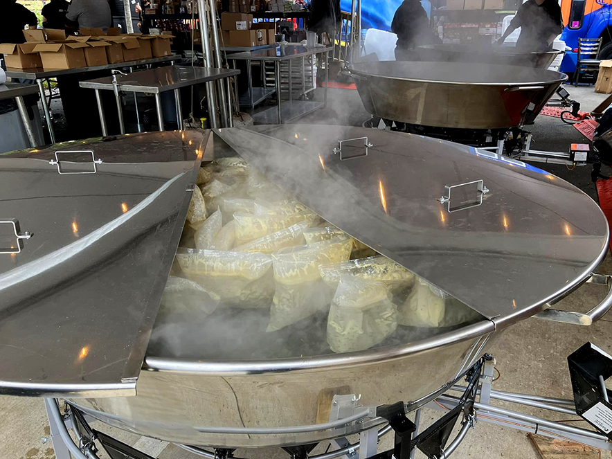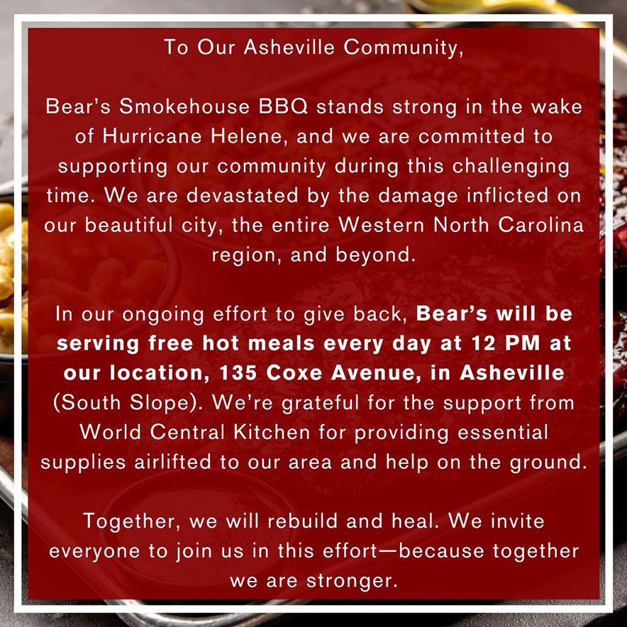 TIMELINE: The storm hit on the night of September 26, 2024. Bear’s started serving free food every day to those in need on Sept 28, and became a field kitchen for World Central Kitchen on Oct 3. Bear’s also partnered with the Red Cross for their meal distribution for a month, and together the three entities have provided approximately 1.5 million meals. WCK is still here in Asheville and will be here working with Bear’s through the end of March.