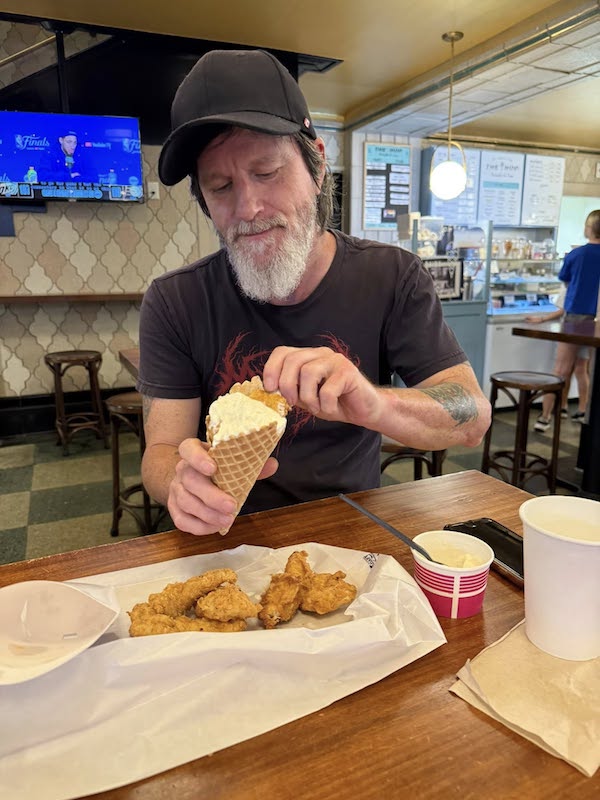 I knew how to make that happen, so I marched my ass down to the local food court inside S&W Cafeteria Building right downtown, where Buxton Chicken Palace is conveniently located about 10 feet away from The Hop Ice Cream. I placed an order for Buxton’s perfectly perfect chicken tendies that I love so very much, and then I turned around and ordered a waffle cone with a scoop of salted caramel iced cream on the side. There was some assembly required but before I knew it I was literally eating my dreams. Or my strange liminal quasi-dreams. And now, as if 2025 couldn’t get any fuckin’ weirder, all of a sudden now I have to fight constant cravings for… fried chicken and ice cream? Oh, for fuck’s sake.