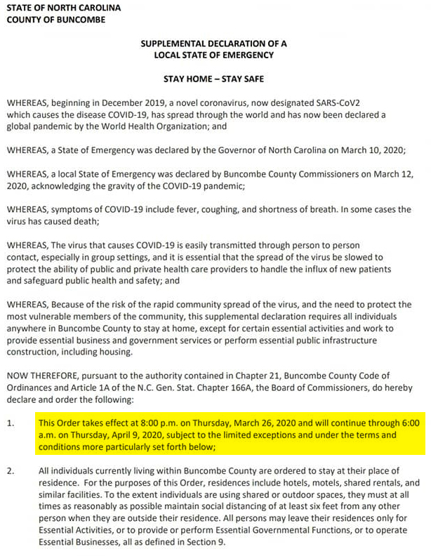 The ten-page-long state issued Stay at Home order more or less reiterates most of what was already in the Buncombe County Stay at Home order, but extends the deadline two weeks beyond The Country’s, and details & defines the social distancing and essential business parameters for the entire state, so that now we’re all on the same page.
