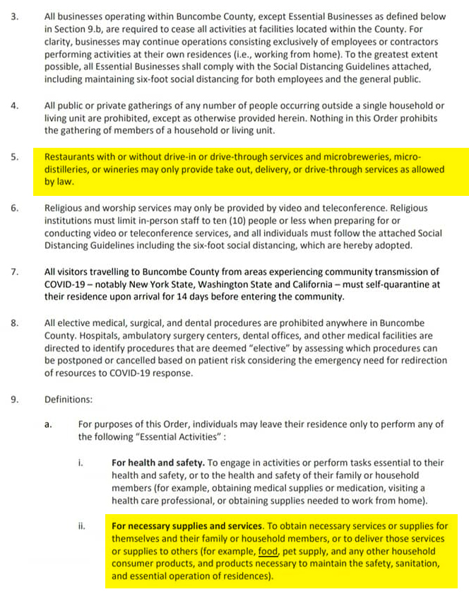 Below is the official Buncombe County Stay at Home order, which began on Friday March 13th, and is meant to last until Thursday April 9th. Meanwhile, public health experts have been pretty explicit in saying that’s too soon, so The County has left room to extend it as needed. In the jpegs below I have highlighted all of the aspects that deal with food and small business in yellow.
