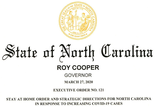 Here is a LINK to a pdf of the most recent state-wide Stay at Home order issued by Gov. Roy Cooper on March 27th, 2020, it goes into effect on March 30th, 2020 and will be in place until April 30th 2020, which again experts are saying that might be too soon, so be prepared for another 30 days after that should public health authorities warrant it.