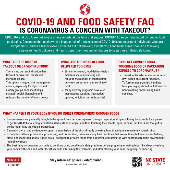 The simple graphic below, created by NC State University has been very helpful in answering some of my biggest questions around take-out and delivery.