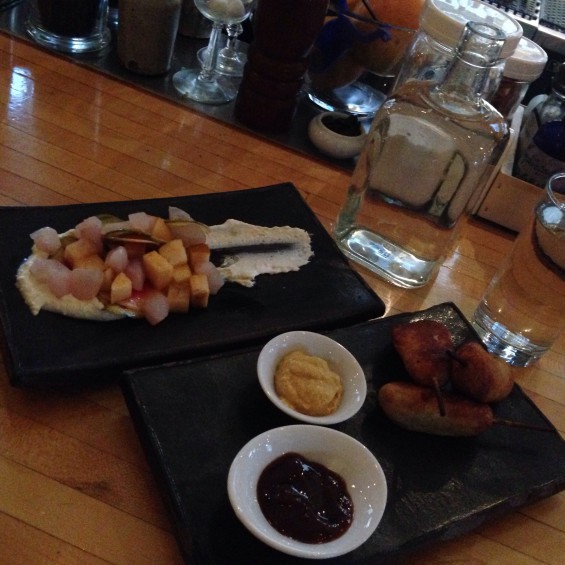 image Published November 2, 2015 at 565 × 565 Dawn got some fancy raw fish and melon thingy at Iperial Life. I got corn dogs.